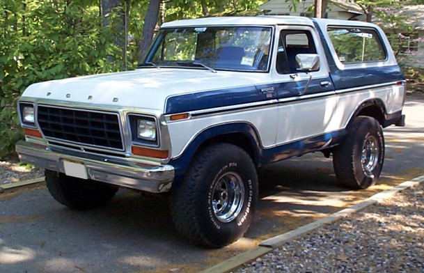 My uncle had this truck, bought off a friend. He just kept it parked by the side of his house, as really, on a farm in West Texas, what use is a play-truck? When I moved to Colorado Springs for my junior year of high school, though, I traded my uncle some cash and my black Ford for this. He still came out shy, was doing me a kindness, and I’m still thankful. This Bronco hooked me on 79 Fords. I mean, Uncle Jesse is where that really started, probably (in later eps, I’m fairly certain he upped his 73 to a 79). But this truck helped. It had a 351-Cleveland, a big four-barrel, headers, a lift kit—everything a junior in high school needs to get in trouble. And I did, over and over. The MPs on Peterson AFB knew me quite a bit better than I wanted them to. I never wrecked it, though. I did get rear-ended in it once, coming home from Air Academy High, but the tailgate popped back out pretty well. The biggest problem with this truck, really? It had these magnesium (I think) wheels on it, which had the lug-holes all wallowed out from running 33s, which meant it was always popping studs, which meant I was forever taking apart the 4WD hubs to rebuild everything. My last couple of months of having this truck—I was back in Texas—I finally lucked into some chrome wagon wheels for it (as lucked onto in the pic below), at which point it became much more trustworthy. My stupidest memory from this truck is a Friday night party in Colorado Springs, where all the parking places on the road in front of this house were taken, so I just walked the Bronco up onto the lush green Rockrimmon lawn. Was all good and fun—got a lot of attention—until it was time to go. The grass was a touch wet, evidently. And my Bronco, for all its size and 4WD and glasspacks, all it could do was spin on that slick grass, until everybody came out from the party to push me back to the road. Last I heard, this truck was a hunting rig in Central Texas. And, no, this isn’t it, but this is just about it—except for the white hood; I’m pretty sure mine was blue. This color scheme, though, of all the color schemes ever, on anything, it’s the best. Metal-flake blue and Ford white. There’s nothing prettier.