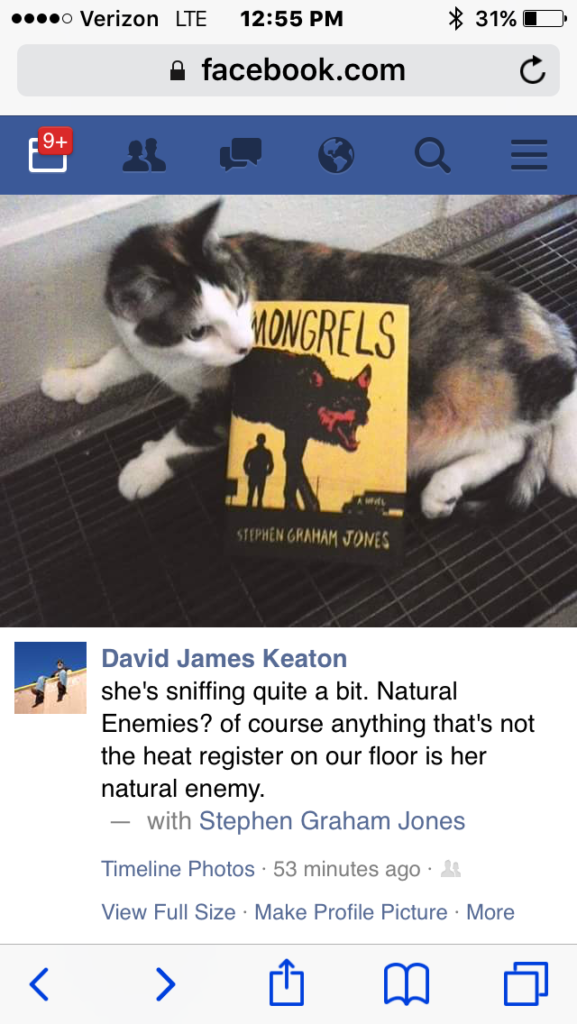 And here’s a before/after—DJK sees Mongrels on the shelves, we skip a lot of steps, and now the cat’s eaten his brain and is using the book as a body pillow, to aid digestion: