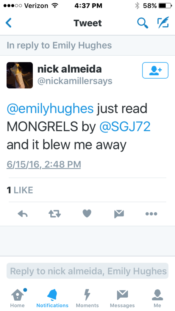 It is so, so nice to see you getting more traction in the book world. Mongrels is still in the TBR stack, as I have a July 3 deadline for a book review (pretty cool mystery), but I’ll get to it. Still trying to decide if starting my own review blog is worth the effort it’ll take (Issues are in play). I mean, very few people know who I am as a reviewer anyway, and there are already a surfeit of book blogs. Sorry. Too much hot air. I guess you seem to me like a person one can easily talk to (so to speak, ar ar). So, hey, stay in the groove and continued best wishes for further success. :-)