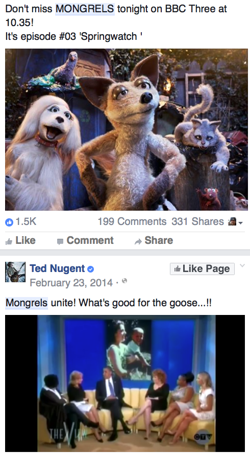 And, talking BBC, I searched “Mongrels” on Facebook, peeled through the yellow-book results, and got to this cool conjunction—Ted Nugent/The View/Obama/Muppets (or puppets, or whatever those things are. could be real for all I know):