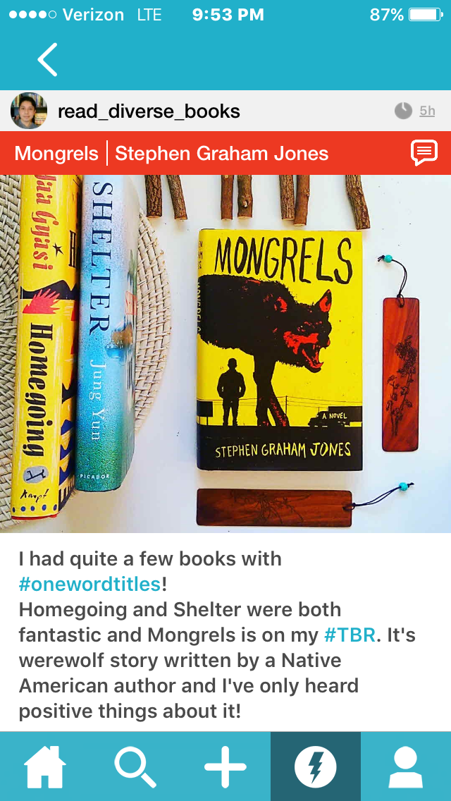 At first I thought Mongrels was being staged next to a stick of dynamite, which got me thinking about Bo Duke (it never takes me much to be suddenly back in Hazzard County). But, you see the spectrum or gradient read_diverse_books has done here? Left to right, we go “home” > “shelter” (which is like temporary home) > “no home.” Pretty cool. Thanks: