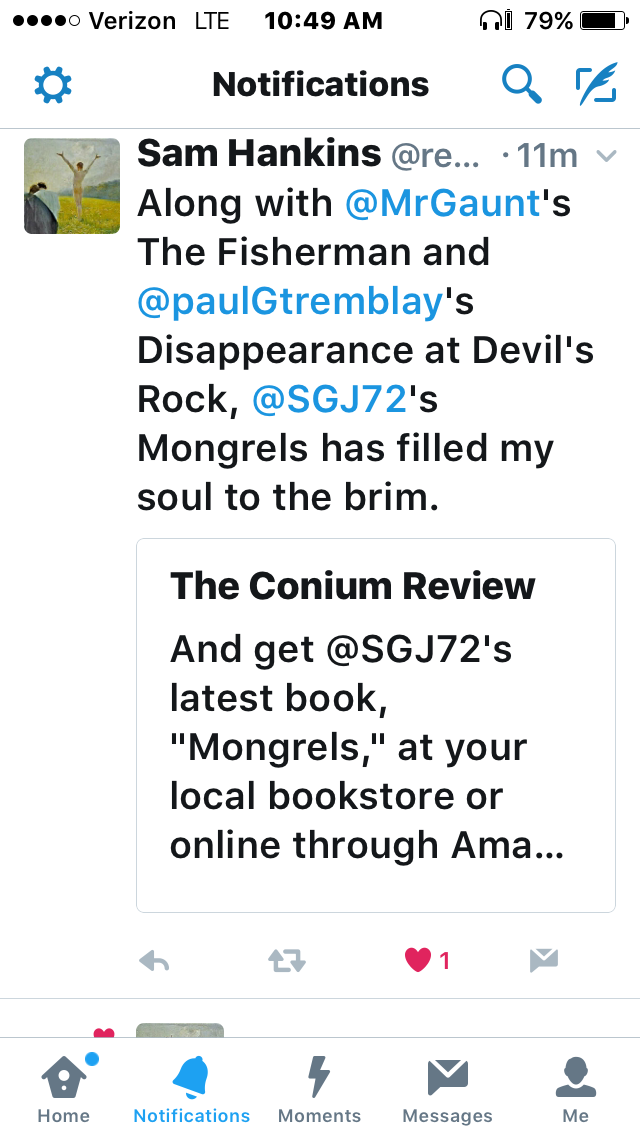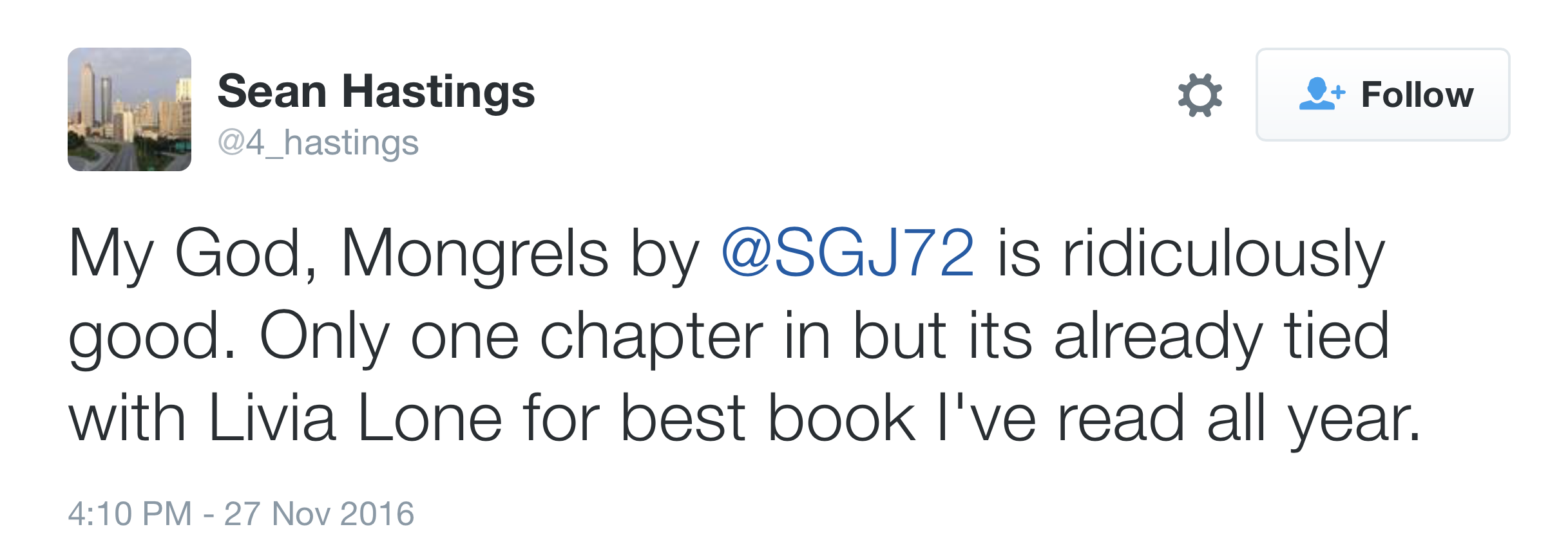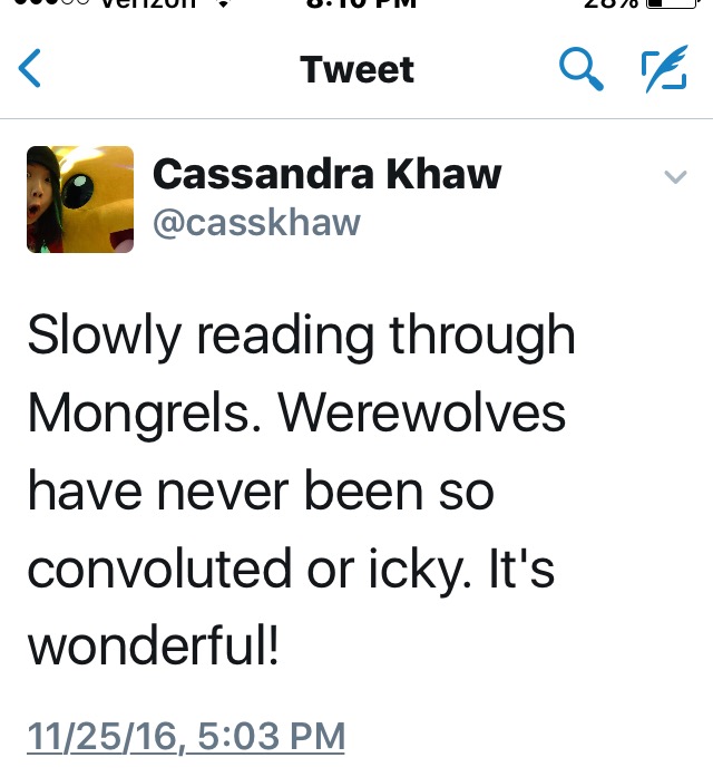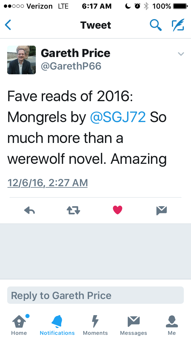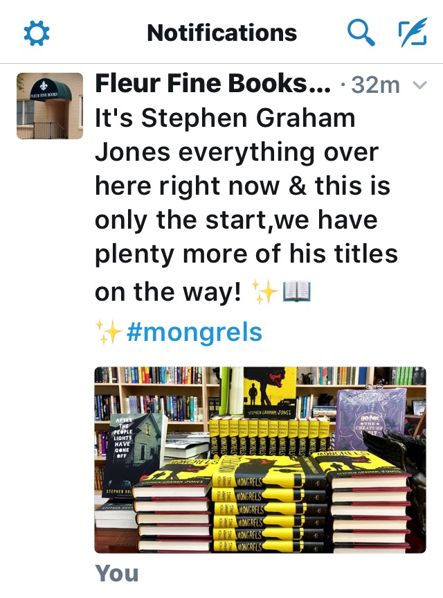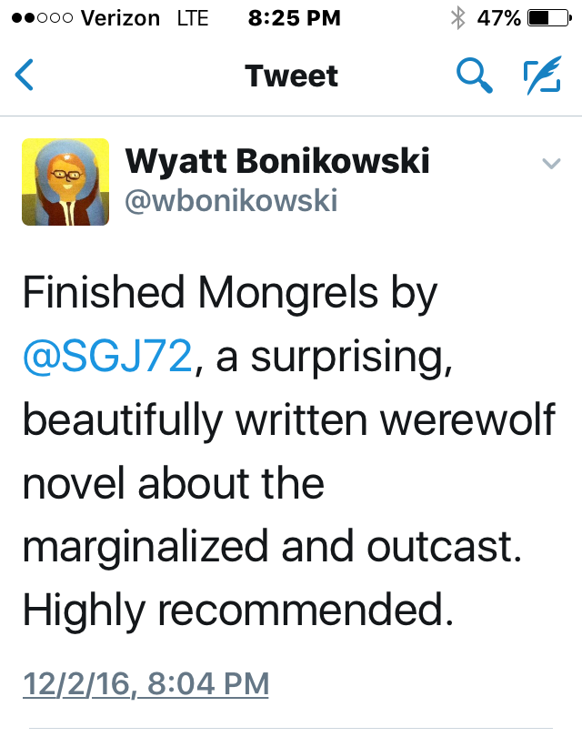 And, see Mike’s Twitter handle? This dude knows more horror than I’ll ever . . . I don’t know, I lost the thread of that. I always lose the thread of those. But: Mike Bracken, I respect what he says. And, yes, Near Dark. Always-always Near Dark. It’s in the post-script for the coming paperback of Mongrels.