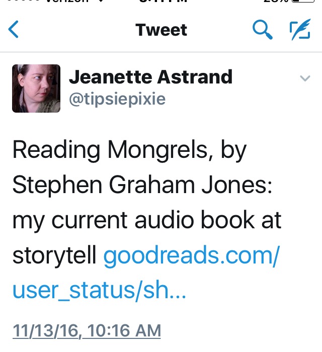 I really need to dial the audio version up. People keep telling me it’s good. Just? It’s always weird, listening to my own stuff read. Because, I mean, for me, for many months, it was in only my voice. Only one of mine I’ve ever been able to get through—because they used a wrestler kind of voice!—was Zombie Bake-Off. But, should I ever sequel Mongrels, I’ll need to remember what-all went on between those yellow covers (sounds like a Flushboy joke, yes) (that’s a high-class book, there).